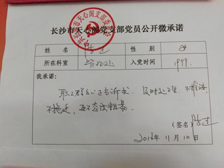 为深入开展“两学一做”学习教育,进一步加强党员思想政治建设,天心阁党支部在党员中开展践行微承诺活动。活动要求党员发起一句贴合实际、力所能及的微承诺,张贴在党务公示栏,立足岗位将承诺内化于心、外化于行,切实落实到实际工作中,主动接受职工及群众的监督。